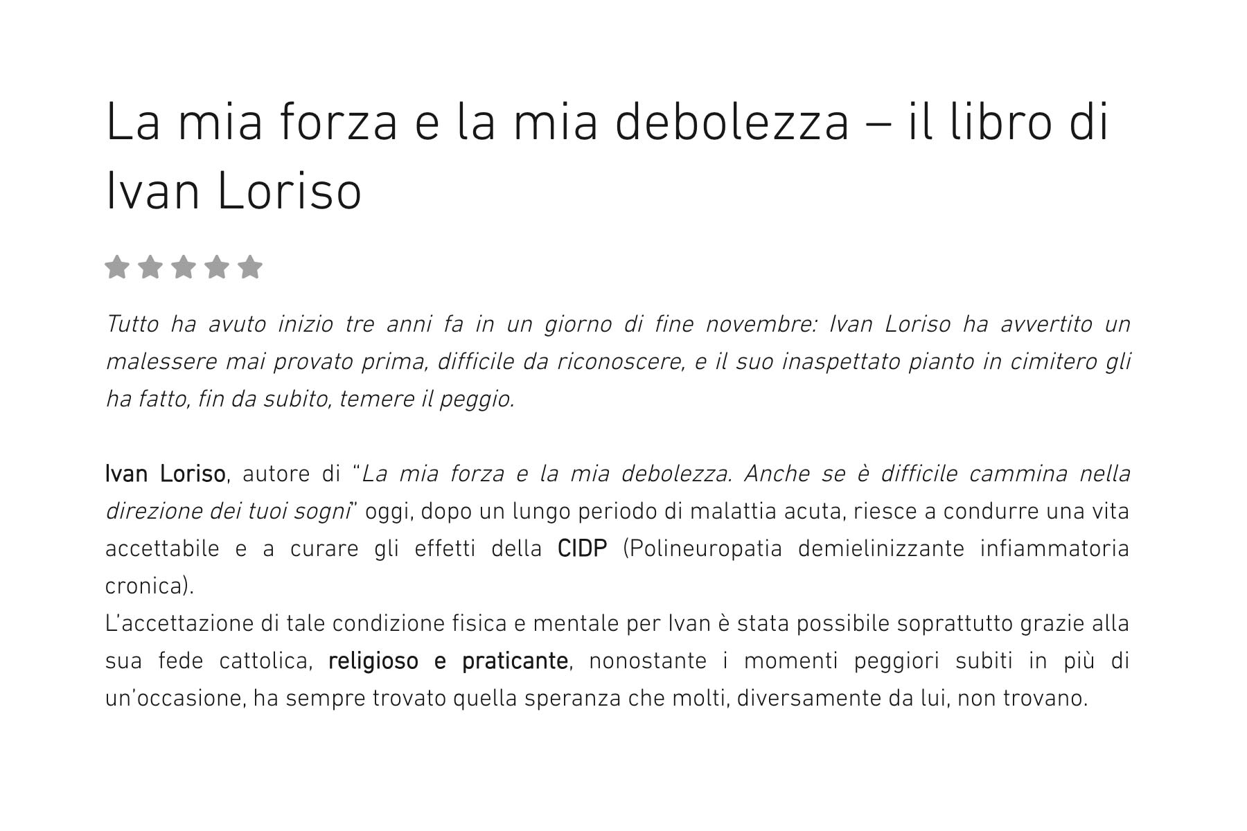 Mi chiamo Ivan Loriso, sono nato a Foggia e da qualche anno mi è stata diagnosticata una malattia rara: CIDP (Polineuropatia demielinizzante infiammatoria cronica). Io non voglio cancellare il mio passato e ne il mio presente, ma voglio raccontare alcuni aspetti della mia storia, non voglio nascondere la solitudine, la debolezza, lo sconforto affrontati ma raccontare anche la costanza, la forza e la fiducia in sé stessi di voler raccontare la propria presenza in questa terribile vicenda, di un filo rosso di positività perla e linfa per tutte le persone che ne hanno bisogno. Dietro a ogni storia di disabilità c’è un passato bruscamente cancellato. Da quando mi sono ammalato ho un altra visione e prospettiva del mondo, di colpo ho capito che i miei occhi e o miei occhiali non bastavano per guarda il mondo. Ero distratto da un vortice di superficialità, non mi ero mai reso conto di quanta gente soffrisse. Non mi ero mai reso conto che oltre al fardello di una inaspettata e non voluta malattia, il malato lotta contro una delle parole più brutte del vocabolario italiano: l’indifferenza