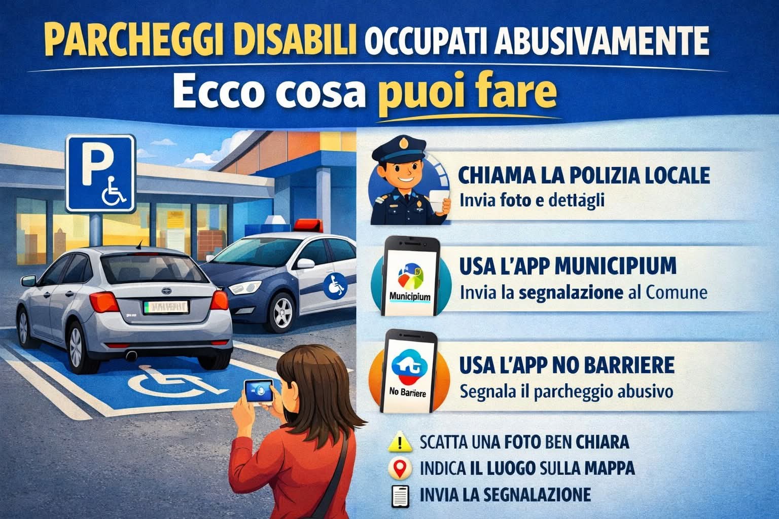 Puoi fare una segnalazione alla Polizia Locale del Comune, anche telefonicamente o via email. Molti comandi accettano segnalazioni con:foto dell’auto, targa visibile luogo preciso, data e orario.Se arrivano più segnalazioni dallo stesso punto (ad esempio davanti a un supermercato), spesso vengono organizzati controlli mirati Le segnalazioni non servono solo per il singolo caso, ma anche per documentare le zone dove il problema si ripete spesso, così da chiedere più controlli e maggiore attenzione. Difendere i parcheggi riservati significa difendere un diritto fondamentale: la libertà di movimento delle persone con disabilità. Anche una semplice segnalazione può aiutare a migliorare le cose.