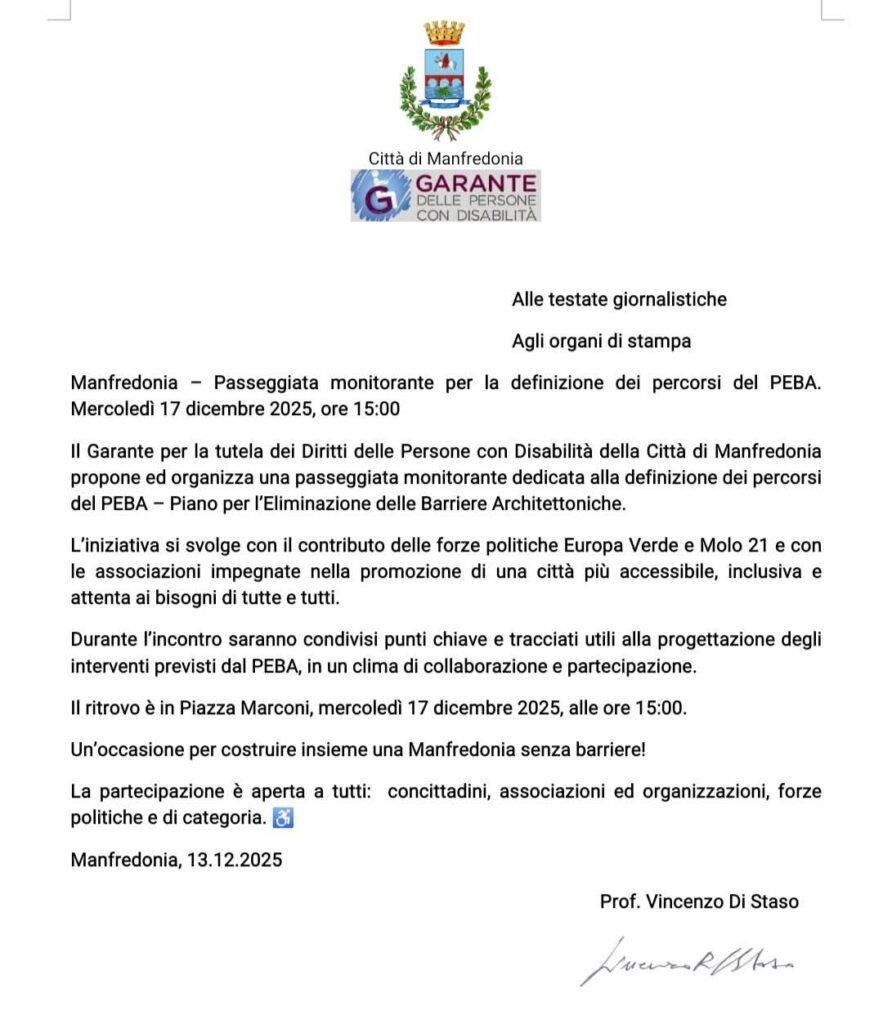 A completare un parterre di assoluto rilievo, la presenza dei familiari e accompagnatori, insieme a quella autorevole di Vincenzo Di Staso, Garante dei diritti delle persone con disabilitร . Presenti anche Maria Grazia Principe, Presidente di ANFFAS Manfredonia, e Monica Mantovano, Presidente di ARS Manfredonia, a testimonianza di una rete territoriale coesa e attenta ai temi dellโ€™inclusione e della salute mentale.